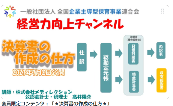 『全企保連 企業主導型保育事業経営力向上チャンネル』 ■第14回:「★経理年間スケジュール★」 ■講師:メディレクション会計事務所 高井 陽介代表(公認会計士・税理士) ■講師略歴: 2007年 3月 慶応義塾大学 経済学部 卒業 2009年 3月 関西学院大学大学院 経営戦略研究科 会計専門職専攻 卒業 公認会計士試験合格後、大手監査法人トーマツに就職。 2017年 4月 株式会社メディレクション/メディレクション会計事務所 設立 現在、全国各地の企業主導型保育園の運営コンサルや会計顧問業務を実施し、保育所運営について幅広い相談に乗っている。 ■コンテンツ概要: ■コンテンツ概要: 財務監査や指導監査に耐えられる決算書の作成の仕方を勉強しましょう! まさに最新版! ■視聴URL 全企保連会員サイトからのみご視聴が可能となります。