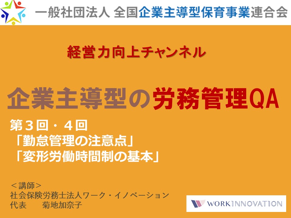 『全企保連 企業主導型保育事業経営力向上チャンネル』 ■労務管理編コンテンツ:「★変形労働時間制の基本★」 ■講師:社会保険労務士法人ワーク・イノベーション 菊地 加奈子代表(社会保険労務士) ■講師略歴: 1977年生まれ、早稲田大学商学部卒。 2010年社会保険労務士法人ワーク・イノベーション開業。 全国社会保険労務士会連合会において保育労務管理部会の委員、 企業主導型保育事業に関する労務監査検討委員として4万人の社労士に向けての保育園労務管理に関する研修を担当し、 保育園や自治体に対しても保育園の労務管理・マネジメント・処遇改善等加算・キャリアパス構築に関するセミナーに多数登壇。 6児の母として働き方改革、女性活躍推進、両立支援といった分野での幅広い企業支援も行っている。