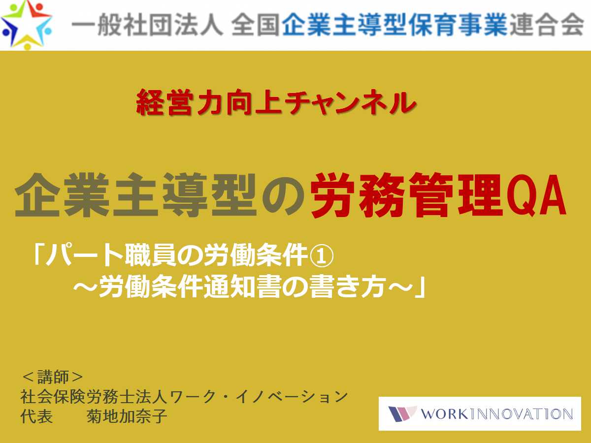 『全企保連 企業主導型保育事業経営力向上チャンネル』 ■労務編コンテンツ:「★パート職員の労働条件① ~労働条件通知書の書き方~★」 ■講師:社会保険労務士法人ワーク・イノベーション 菊地 加奈子代表(社会保険労務士) ■講師略歴: 1977年生まれ、早稲田大学商学部卒。 2010年社会保険労務士法人ワーク・イノベーション開業。 全国社会保険労務士会連合会において保育労務管理部会の委員、 企業主導型保育事業に関する労務監査検討委員として4万人の社労士に向けての保育園労務管理に関する研修を担当し、 保育園や自治体に対しても保育園の労務管理・マネジメント・処遇改善等加算・キャリアパス構築に関するセミナーに多数登壇。 6児の母として働き方改革、女性活躍推進、両立支援といった分野での幅広い企業支援も行っている。