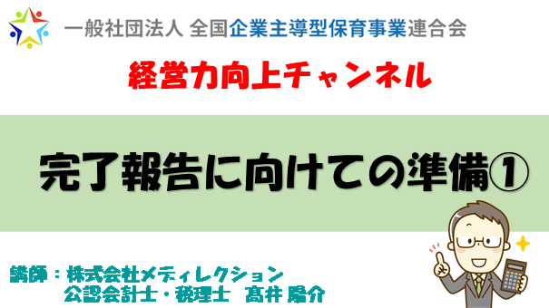 『全企保連 企業主導型保育事業経営力向上チャンネル』 ■財務編コンテンツ「★完了報告に向けての準備①★」 ■講師:メディレクション会計事務所 高井 陽介代表(公認会計士・税理士) ■講師略歴: 2007年 3月 慶応義塾大学 経済学部 卒業 2009年 3月 関西学院大学大学院 経営戦略研究科 会計専門職専攻 卒業 公認会計士試験合格後、大手監査法人トーマツに就職。 2017年 4月 株式会社メディレクション/メディレクション会計事務所 設立 現在、全国各地の企業主導型保育園の運営コンサルや会計顧問業務を実施し、保育所運営について幅広い相談に乗っている。 ■コンテンツ概要: 完了報告に向けて主要な調整項目の把握とその準備で押さえておきたいポイントを詳しく解説しております。 ■視聴URL 全企保連会員サイトからのみご視聴が可能となります。