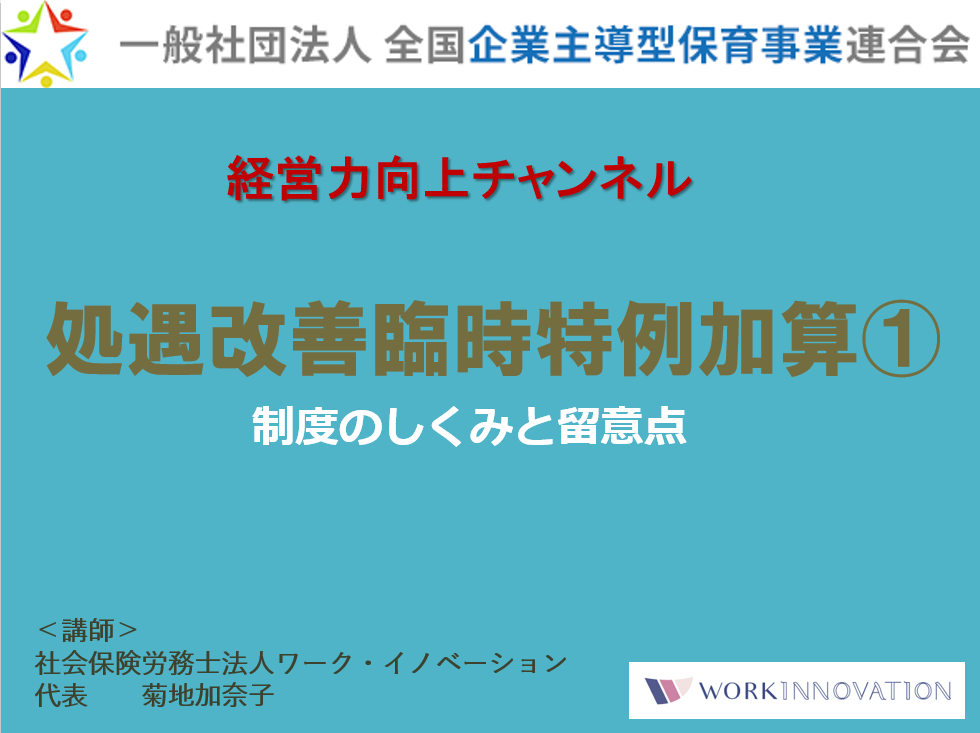 『全企保連 企業主導型保育事業経営力向上チャンネル』 ■労務編コンテンツ:「★保育士等処遇改善 臨時加算①~制度のしくみと留意点~~★」 ■講師:社会保険労務士法人ワーク・イノベーション 菊地 加奈子代表(社会保険労務士) ■講師略歴: 1977年生まれ、早稲田大学商学部卒。 2010年社会保険労務士法人ワーク・イノベーション開業。 全国社会保険労務士会連合会において保育労務管理部会の委員、 企業主導型保育事業に関する労務監査検討委員として4万人の社労士に向けての保育園労務管理に関する研修を担当し、 保育園や自治体に対しても保育園の労務管理・マネジメント・処遇改善等加算・キャリアパス構築に関するセミナーに多数登壇。 6児の母として働き方改革、女性活躍推進、両立支援といった分野での幅広い企業支援も行っている。