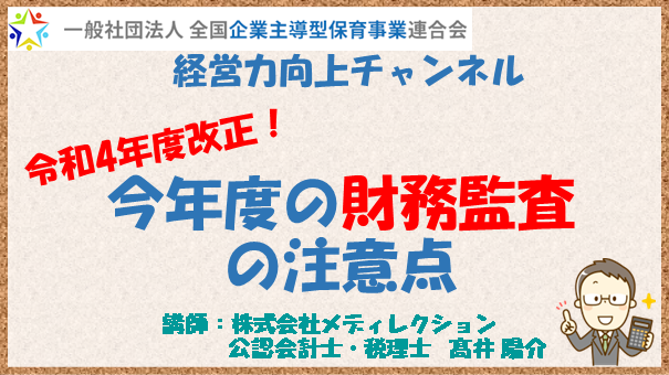 『全企保連 企業主導型保育事業経営力向上チャンネル』 ■財務編コンテンツ:「令和4年度改正!今年度の財務監査の注意点」 ■講師:メディレクション会計事務所 高井 陽介代表(公認会計士・税理士) ■講師略歴: 2007年 3月 慶応義塾大学 経済学部 卒業 2009年 3月 関西学院大学大学院 経営戦略研究科 会計専門職専攻 卒業 公認会計士試験合格後、大手監査法人トーマツに就職。 2017年 4月 株式会社メディレクション/メディレクション会計事務所 設立 現在、全国各地の企業主導型保育園の運営コンサルや会計顧問業務を実施し、保育所運営について幅広い相談に乗っている。 ■コンテンツ概要: 令和4年度の専門的財務監査の評価基準の改正に当たっての基本的な考え方から監査事項の追加項目まで、適切な対応が必要なポイントを詳しく解説 ■視聴URL 全企保連会員サイトからのみご視聴が可能となります。